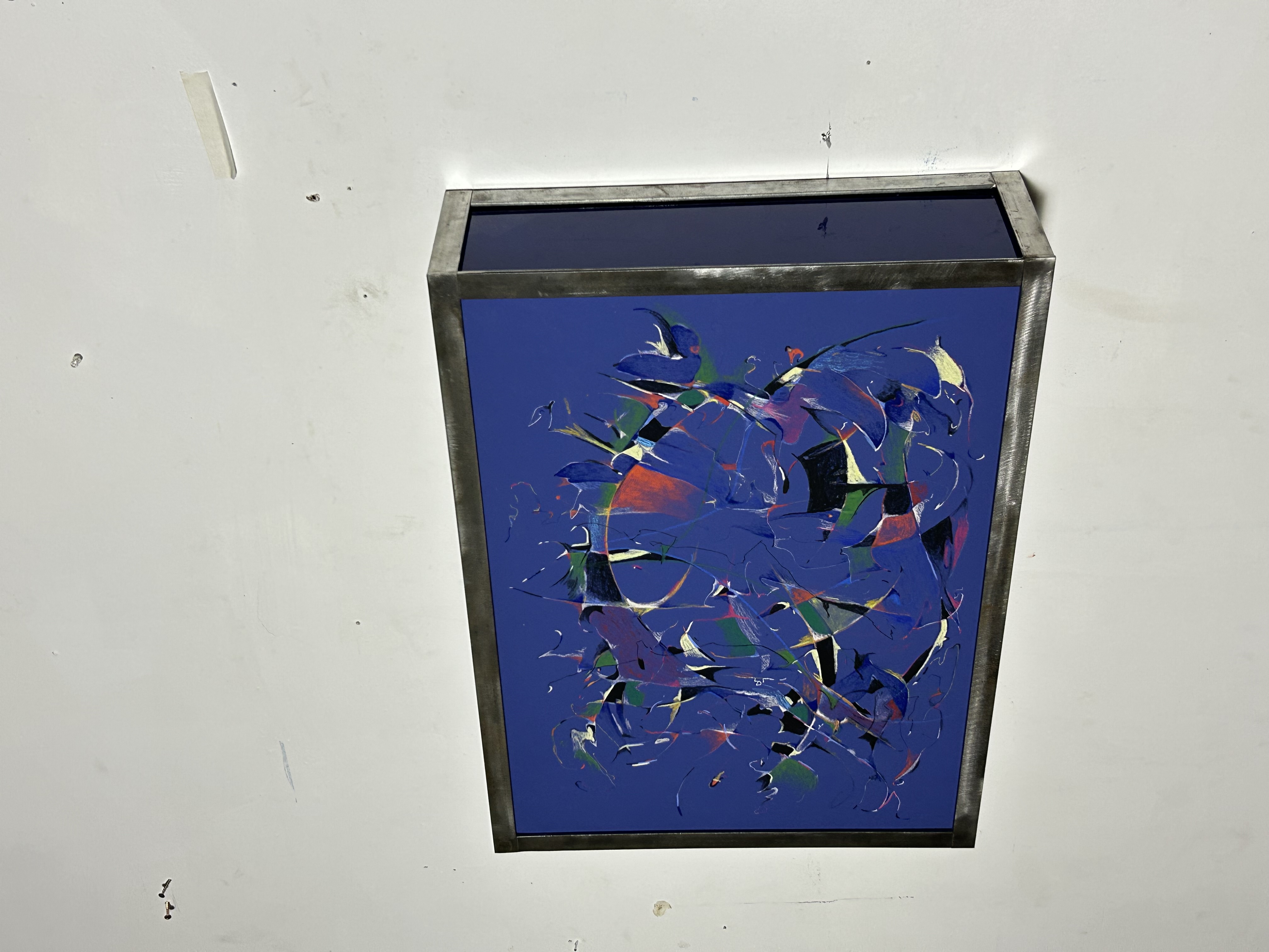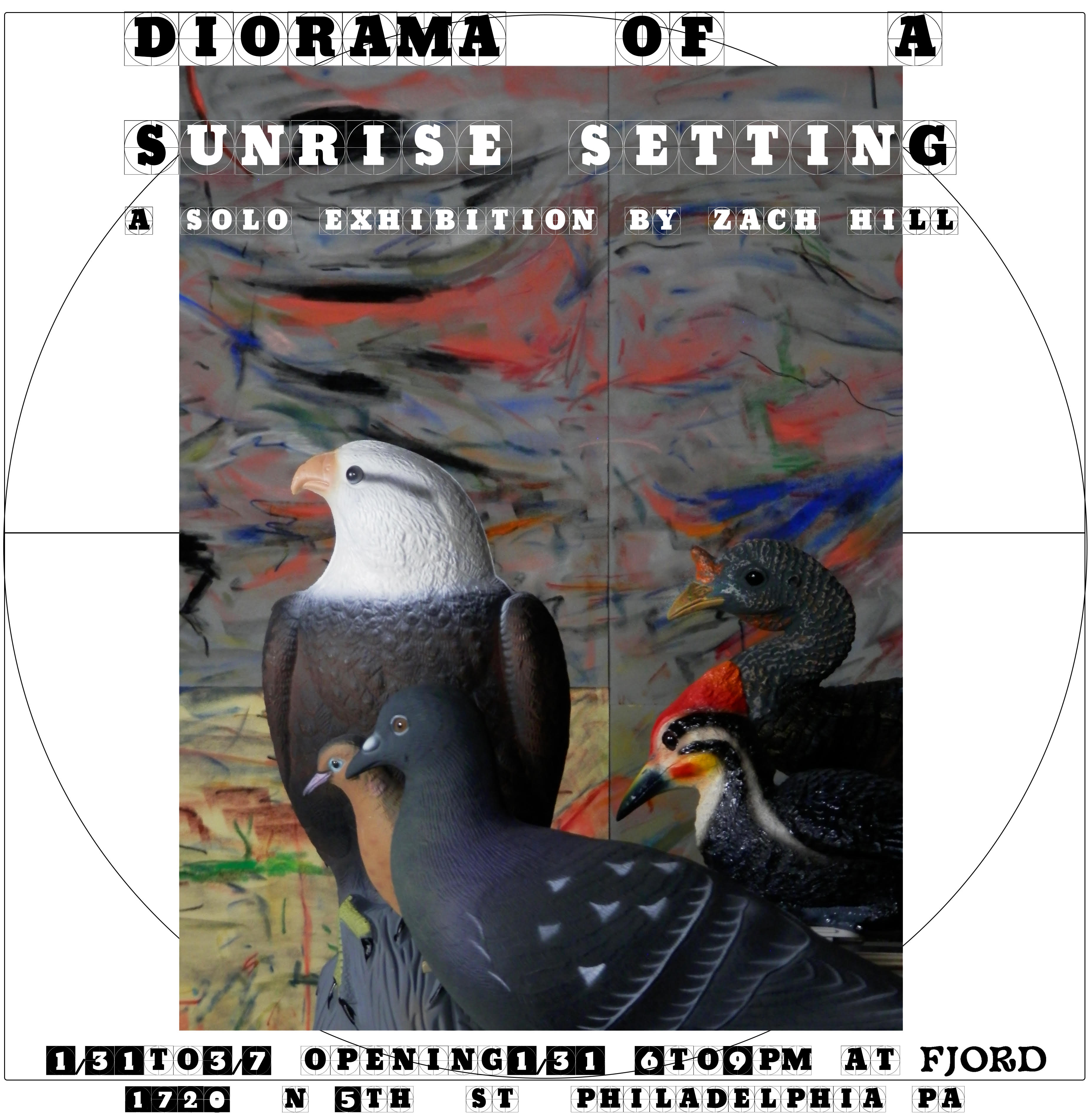 Like any proper diorama, this exhibition depicts landscape, the human figure, animality, and implements, all blurred through a literal giant lens. A sunrise setting is not only a refusive action, but a time and place that is frozen in the infinite blue, orange and pink of a shifting horizon line.