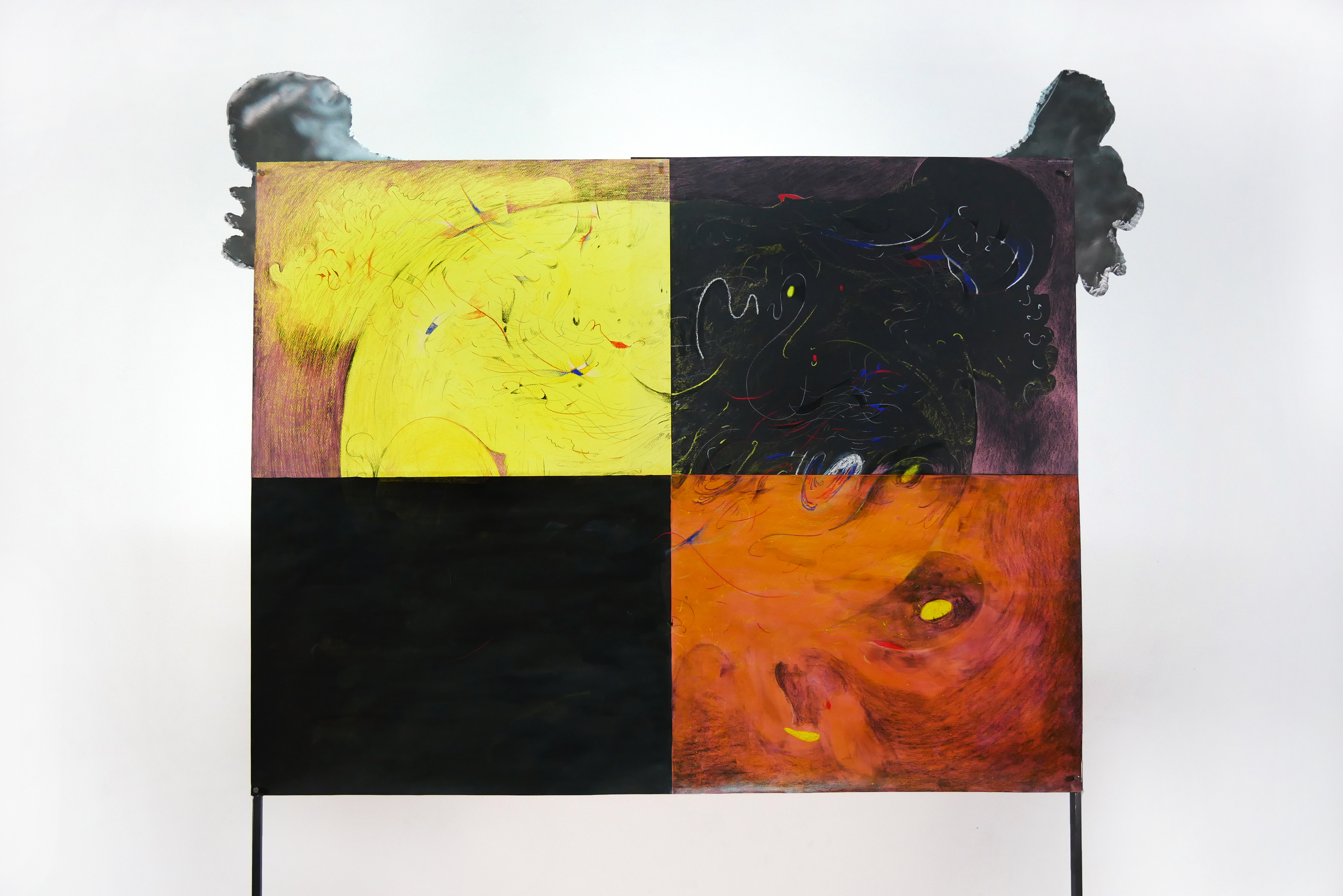 Through formal and material abstractions, Hill presents a scene with its toes confidently grounded on the edge of a cliff. Using drawing as point of origin to create multidimensional works that play with material identity, visual perception, and speculative utility, he hones a queer logic of assemblage to anthropomorphize various devices, infrastructures, and iconography.